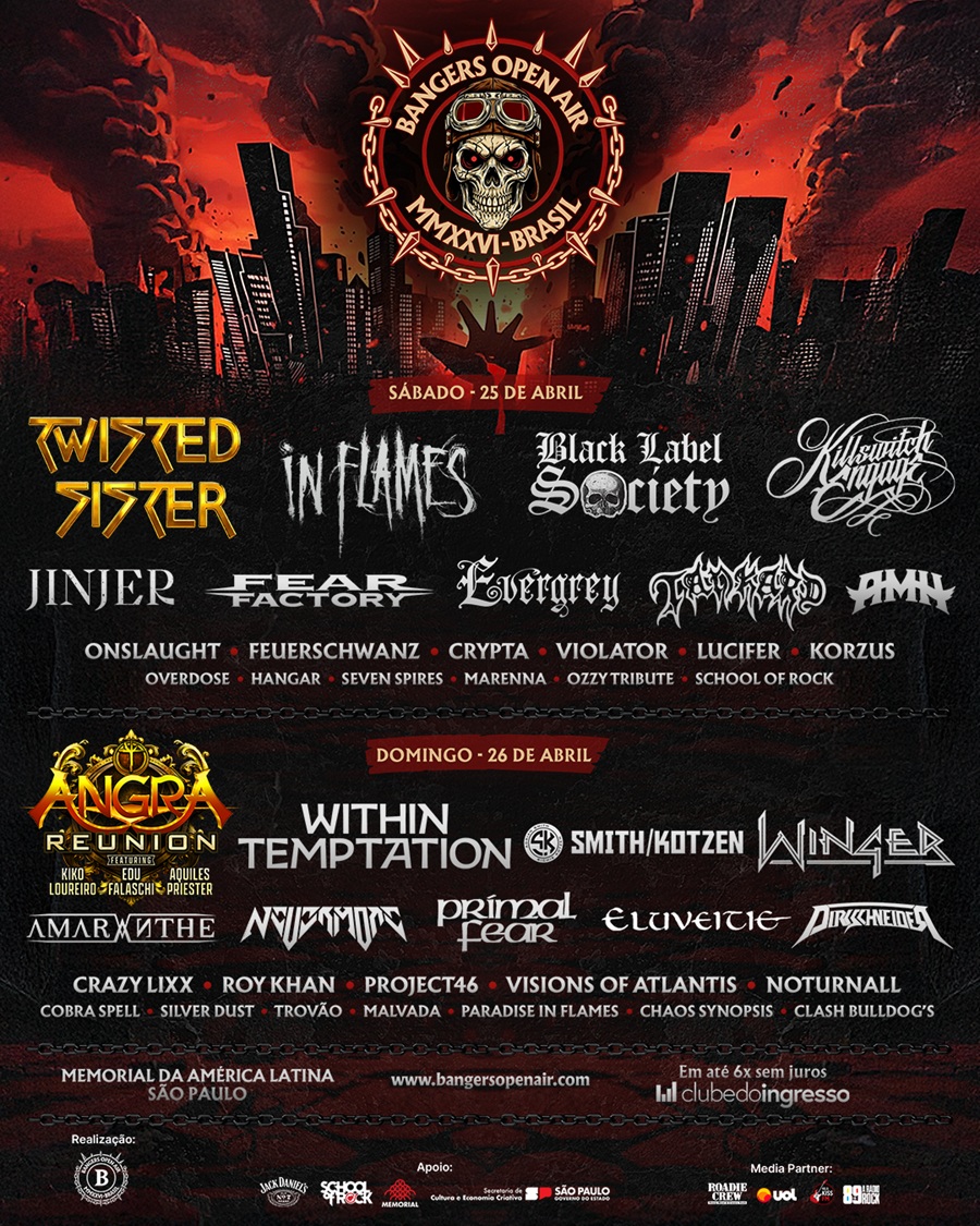 O Bangers Open Air 2026 anuncia o line-up da edição que será realizada nos dias 25 e 26 de abril no Memorial da América Latina, em São Paulo (SP). Alguns dos primeiros nomes divulgados foram BLACK LABEL SOCIETY, PRIMAL FEAR, TANKARD, FEUERSCHWANZ, KORZUS, NEVERMORE, PROJECT46, WITHIN TEMPTATION e CRYPTA. Entre as atrações recém divulgadas, estão KILLSWITCH ENGAGE, JINJER, e o tão requisitado pelo público IN FLAMES. Também foram confirmadas as presenças de WINGER, FEAR FACTORY, ONSLAUGHT, EVERGREY, ELUVEITIE, AMARANTHE, DIRKSCHNEIDER, LUCIFER, COBRA SPELL, CRAZY LIXX, ROY KHAN, SEVEN SPIRES, VISIONS OF ATLANTIS, SILVER DUST, e SMITH/KOTZEN, de Adrian Smith (Iron Maiden) e Richie Kotzen.