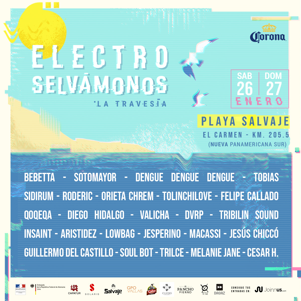 Selvámonos anuncia el esperado line-up de ‘Electro Selvámonos’, la fiesta que conjuga arte, música electrónica y naturaleza, y que este 2019 se convertirá en un festival fuera de Lima, en el kilómetro 205.5 de la Nueva Panamericana Sur, a una playa escondida cerca de Paracas: la Playa Salvaje. Serán dos días de playa con actividades náuticas, fogatas y un área de camping ecológico al mejor estilo Selvámonos, con ferias de diseño y gastronomía y un line-up de música electrónica que combina Techno, House,